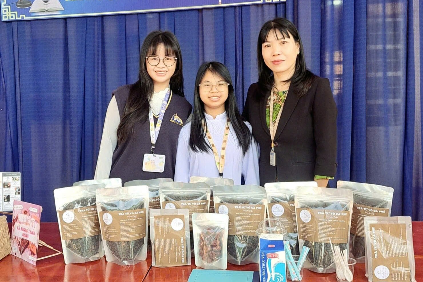 Cô Mai cùng 2 học sinh Phương Uyên và Quỳnh Hoa bên sản phẩm “Trà từ vỏ cà phê” tại Ngày hội STEM Trường THPT Tân Hà