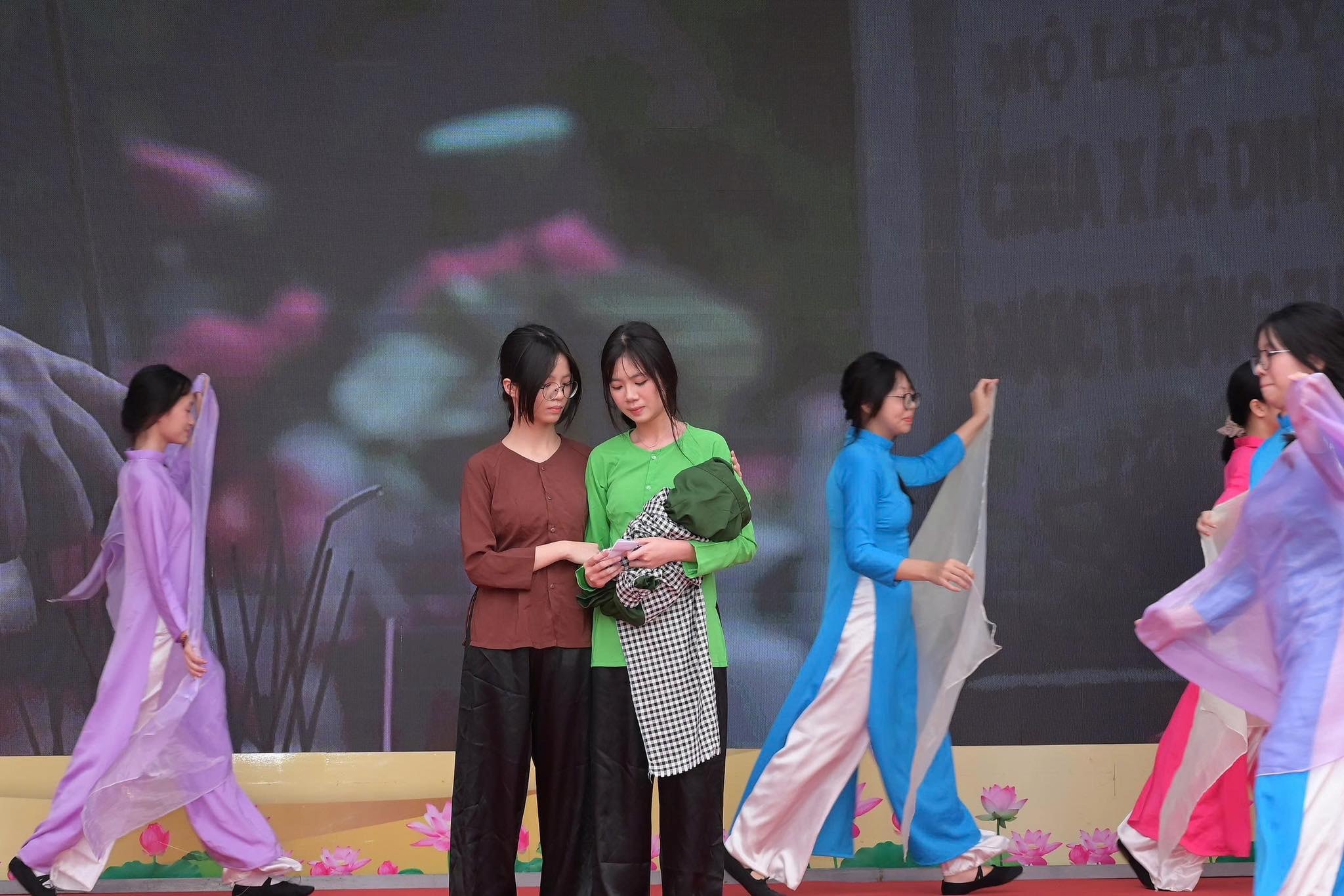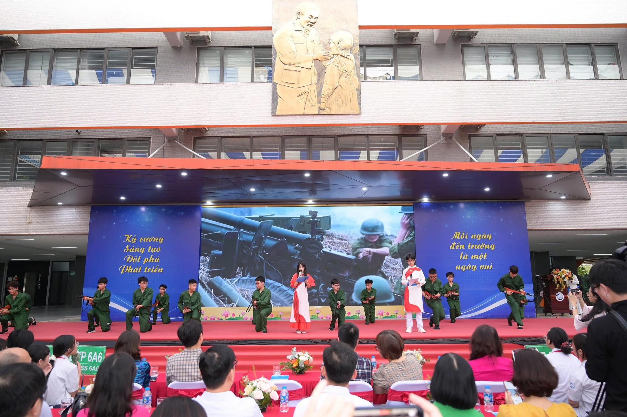 Trên sân khấu của Trường THCS Trần Duy Hưng, hơn 2.000 học sinh đã cùng lắng lại trước những trang sách được tái hiện sống động. Những câu chuyện về chiến tranh không còn nằm yên trên trang giấy mà trở thành các hoạt cảnh chân thực, được dàn dựng công phu từ nội dung đến hình thức, góp phần khắc sâu thông điệp về giá trị của hòa bình.