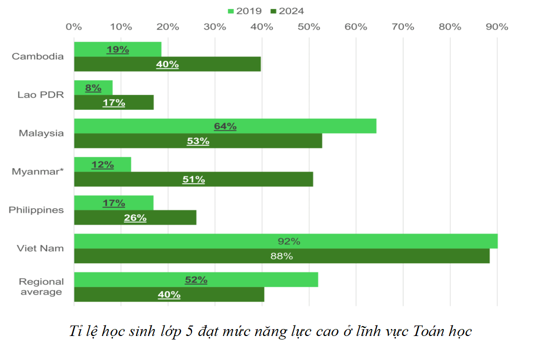 Ở chu kỳ 2024, tỉ lệ học sinh Việt Nam đạt mức năng lực cao ở lĩnh vực Toán học là 88%, cao hơn tỉ lệ của các quốc gia còn lại và cao hơn mức trung bình của khu vực (đạt 36%).