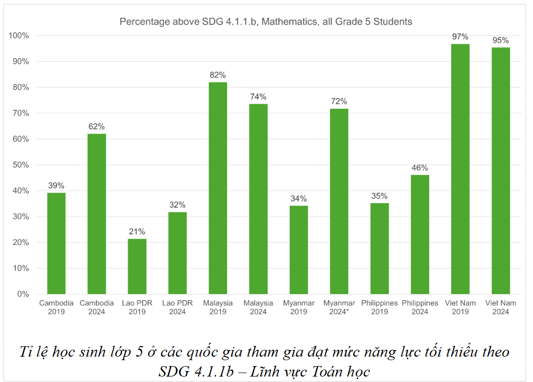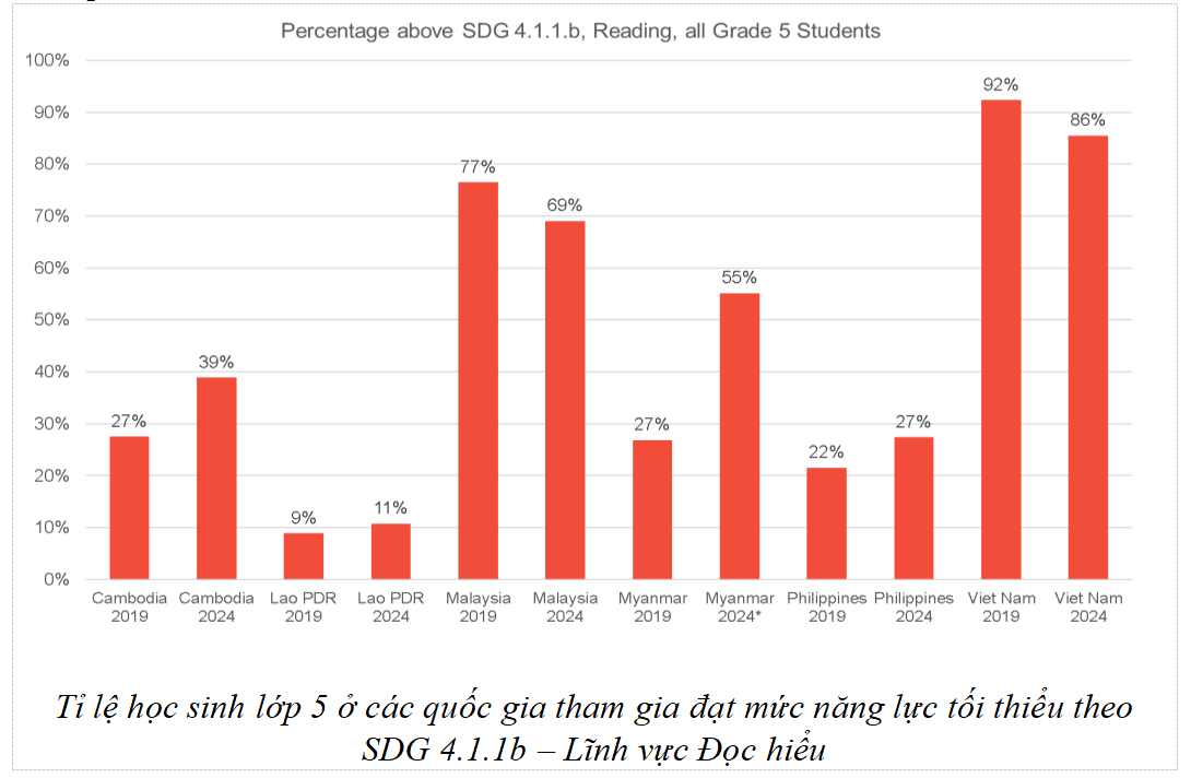 Việt Nam cũng có tỉ lệ học sinh đạt mức năng lực tối thiểu cao nhất khi so sánh với Mục tiêu phát triển bền vững ở lĩnh vực Đọc hiểu (86%) và Toán học (95%).