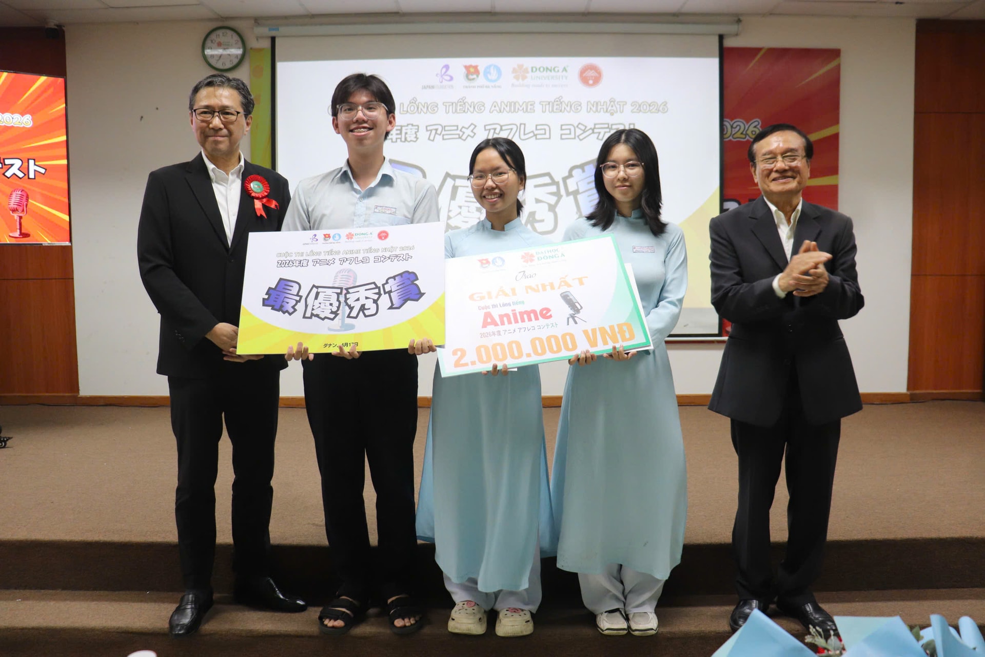 Ban tổ chức trao giải Nhất cuộc thi “Lồng tiếng Anime tiếng Nhật 2026” cho đội thi Trường THPT Chuyên Lê Quý Đôn. Ảnh: KHÁNH NGÂN