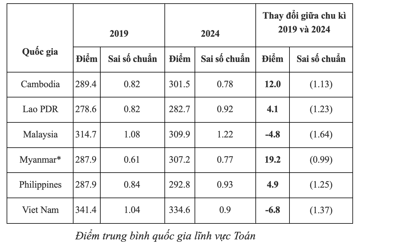 Báo cáo được công bố bởi Ban Thư ký SEAMEO cho thấy, học sinh lớp 5 Việt Nam xuất sắc đạt điểm cao nhất ở lĩnh vực Toán với điểm trung bình là 334,6 điểm (giảm 1,99% so với kết quả chu kì 2019).