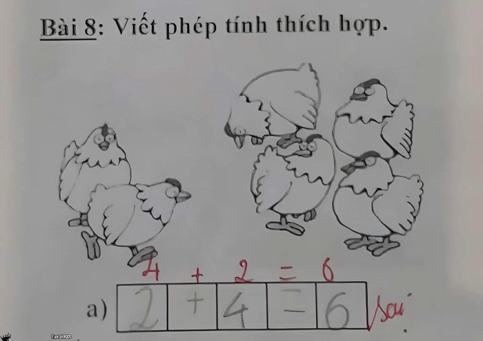 Tưởng chừng như phép tính này không có gì phải bàn cãi thì cô giáo lại bất ngờ gạch sai; đồng thời, cô giáo sửa lại thành phép toán đúng: "4+2=6".