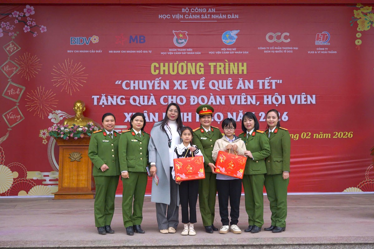 Chia sẻ về chuỗi hoạt động "Chuyến xe về quê ăn Tết" của Học viện CSND năm nay, Trung tá Lại Thị Hiền, Chủ tịch Hội Phụ nữ Học viện, cho biết: trong không khí rộn ràng đón chào Xuân mới Bính Ngọ 2026, Học viện đã tổ chức chuỗi hoạt động "Chuyến xe về quê ăn Tết" và trao tặng hàng trăm suất quà, mang mùa xuân ấm áp đến với cán bộ, học viên có hoàn cảnh khó khăn. Chương trình do Đoàn Thanh niên Học viện chủ trì, phối hợp cùng Hội Phụ nữ Học viện tổ chức, với sự đồng hành của các đơn vị, doanh nghiệp, ngân hàng…