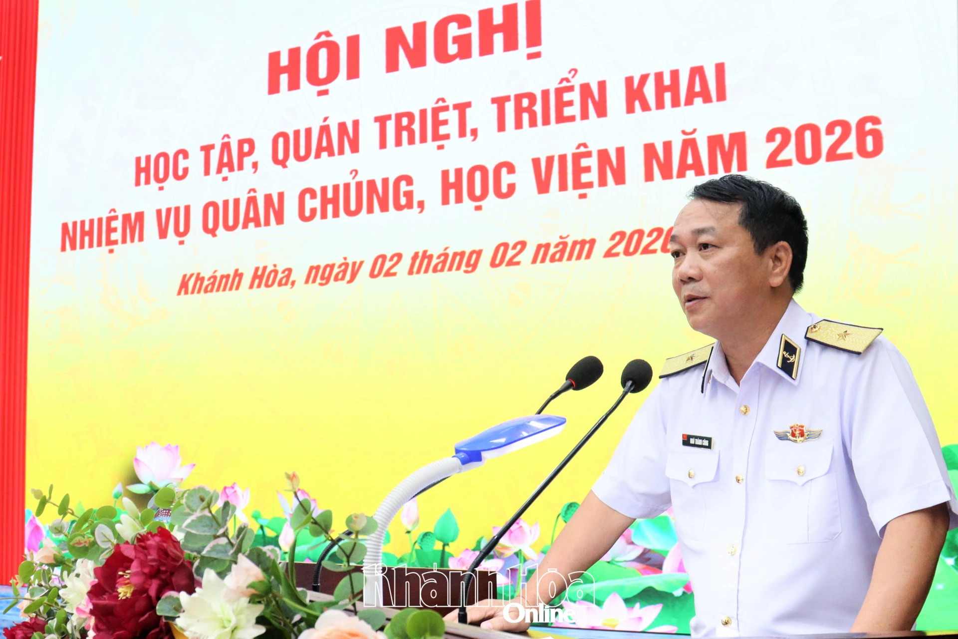 Tại hội nghị, Chuẩn Đô đốc Ngô Thành Công quán triệt chuyên đề “Phát huy sức mạnh tổng hợp, xây dựng quân chủng, học viện cách mạng, chính quy, tinh nhuệ, hiện đại, hoàn thành xuất sắc nhiệm vụ quân sự - quốc phòng năm 2026”. Trong đó, nhấn mạnh và quán triệt sâu sắc, triển khai thực hiện chỉ đạo của Tổng Bí thư Tô Lâm về “2 kiên định, 2 đẩy mạnh, 2 ngăn ngừa” và phương châm “5 vững”. Qua đó, giúp cán bộ, sĩ quan nắm chắc phương hướng, các mục tiêu, nhiệm vụ trọng tâm, khâu đột phá của quân chủng, học viện năm 2026; thống nhất ý chí và hành động, xây dựng tinh thần quyết tâm, đoàn kết, chủ động khắc phục khó khăn, phấn đấu hoàn thành xuất sắc nhiệm vụ được giao.