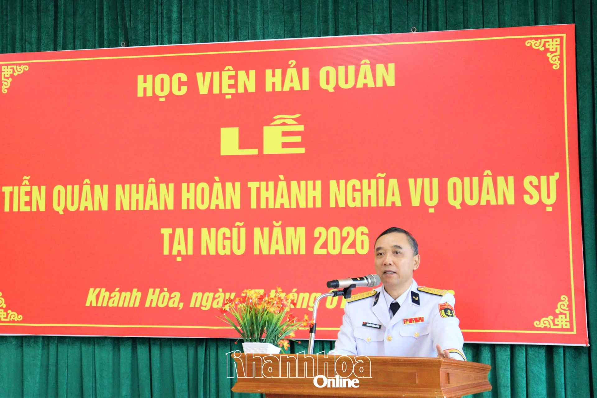 Tại buổi lễ, Đại tá Nguyễn Đình Giảng ghi nhận và biểu dương sự đóng góp của hạ sĩ quan, binh sĩ trong thời gian thực hiện nghĩa vụ quân sự tại học viện; đồng thời mong muốn khi xuất ngũ trở về địa phương, các quân nhân tiếp tục giữ vững và phát huy phẩm chất “Bộ đội Cụ Hồ - Người chiến sĩ Hải quân” thời kỳ mới, truyền thống vẻ vang của Quân chủng Hải quân và Học viện Hải quân anh hùng; tiếp tục phấn đấu thực hiện tốt nghĩa vụ công dân; tham gia xây dựng lực lượng dự bị động viên của địa phương.
