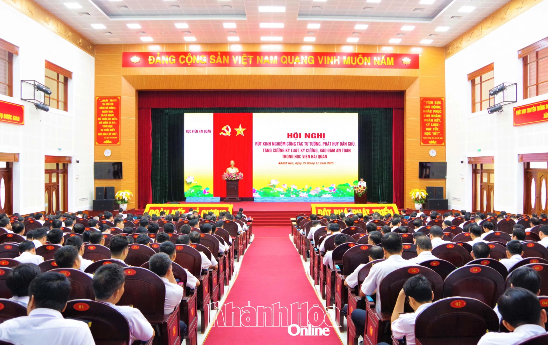 Chiều 25-12, Học viện Hải quân tổ chức hội nghị rút kinh nghiệm công tác tư tưởng, phát huy dân chủ, tăng cường kỷ luật, kỷ cương và bảo đảm an toàn năm 2025. Chuẩn Đô đốc Nguyễn Hữu Thoan - Bí thư Đảng ủy, Chính ủy Học viện chủ trì hội nghị.