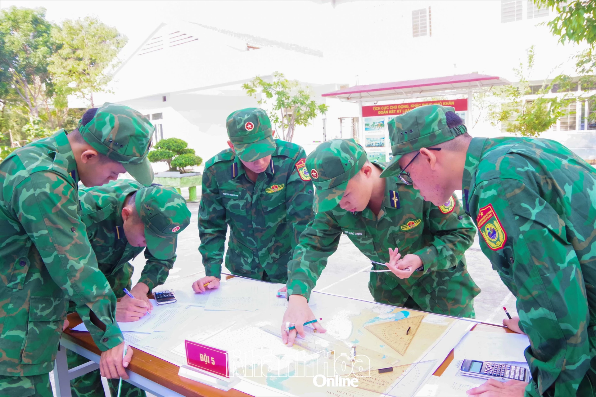 Đội thi lớp Biên phòng tác nghiệp trên hải đồ.