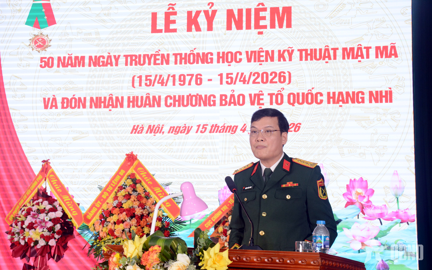 Đại tá, TS Hoàng Văn Thức, Giám đốc Học viện Kỹ thuật mật mã trình bày diễn văn kỷ niệm.