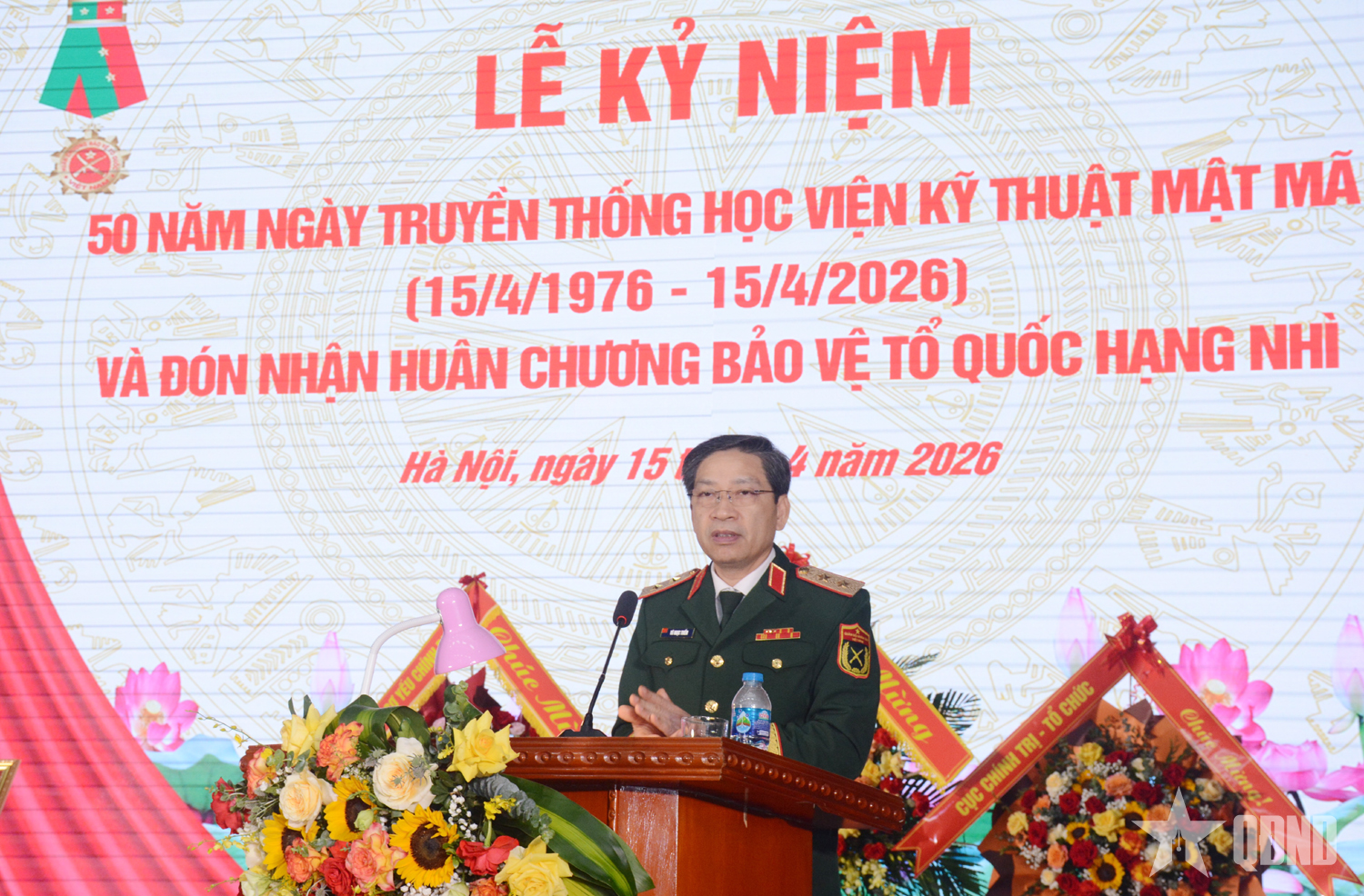 Thừa ủy quyền của Chủ tịch nước, Trung tướng Vũ Ngọc Thiềm trao Huân chương Bảo vệ Tổ quốc hạng Nhì tặng Học viện Kỹ thuật mật mã.