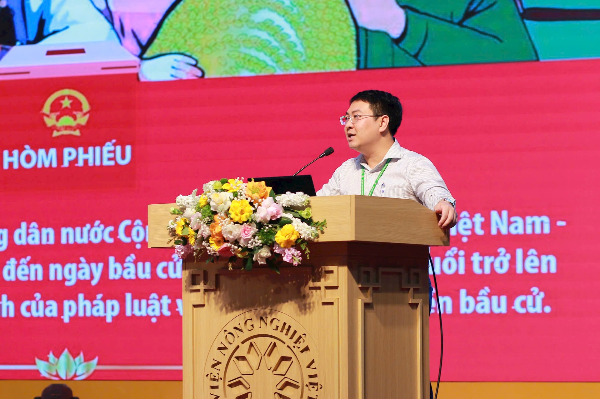 Trình bày nội dung về bầu cử đại biểu Quốc hội và đại biểu HĐND các cấp, Bí thư Đoàn Thanh niên Cộng sản Hồ Chí Minh, Học viện Nông nghiệp Việt Nam Nguyễn Trọng Tuynh cho biết, Học viện Nông nghiệp Việt Nam nằm trên địa bàn xã Gia Lâm, cử tri sẽ thực hiện bầu cử đại biểu Quốc hội thuộc đơn vị bầu cử số 10 thành phố Hà Nội, gồm 5 ứng cử viên: Đồng chí Nguyễn Duy Ngọc, Ủy viên Bộ Chính trị, Bí thư Thành ủy Hà Nội; đồng chí Lâm Thị Phương Thanh, Ủy viên Trung ương Đảng, Thứ trưởng Thường trực Bộ Văn hóa, Thể thao và Du lịch; đồng chí Âu Thị Thúy Hà, Phó Trưởng ban Đầu tư - Mua sắm, Tổng Công ty Hàng không Việt Nam; đồng chí Nguyễn Đức Huấn, chuyên viên chính Văn phòng Đoàn đại biểu Quốc hội và HĐND thành phố Hà Nội; Đại tá Lê Nhật Thành, Phó Cục trưởng Cục An ninh nội địa - Bộ Công an, biệt phái là đại biểu Quốc hội hoạt động chuyên trách tại Hội đồng Dân tộc của Quốc hội khóa XV.