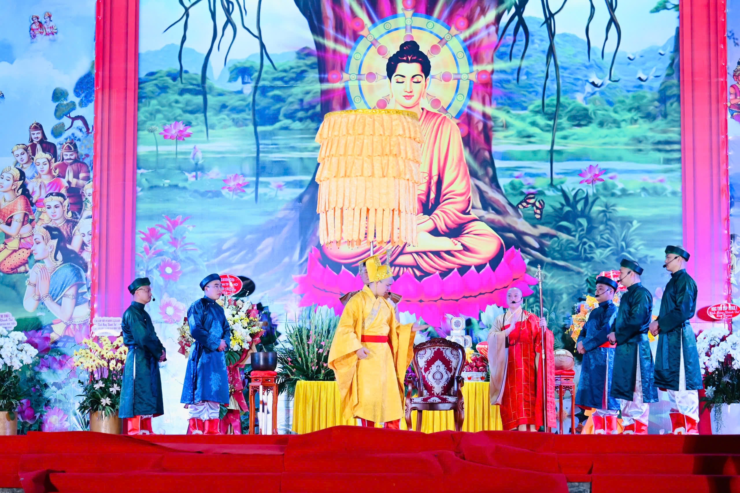 Các tăng, ni sinh Học viện Phật giáo Việt Nam tại Hà Nội diễn kịch kể chuyện vua Lý Công Uẩn dời đô về Thăng Long, mở ra kỷ nguyên phát triển thịnh vượng của Vương triều Lý, vương Triều có sự gắn bó mật thiết với đạo Phật