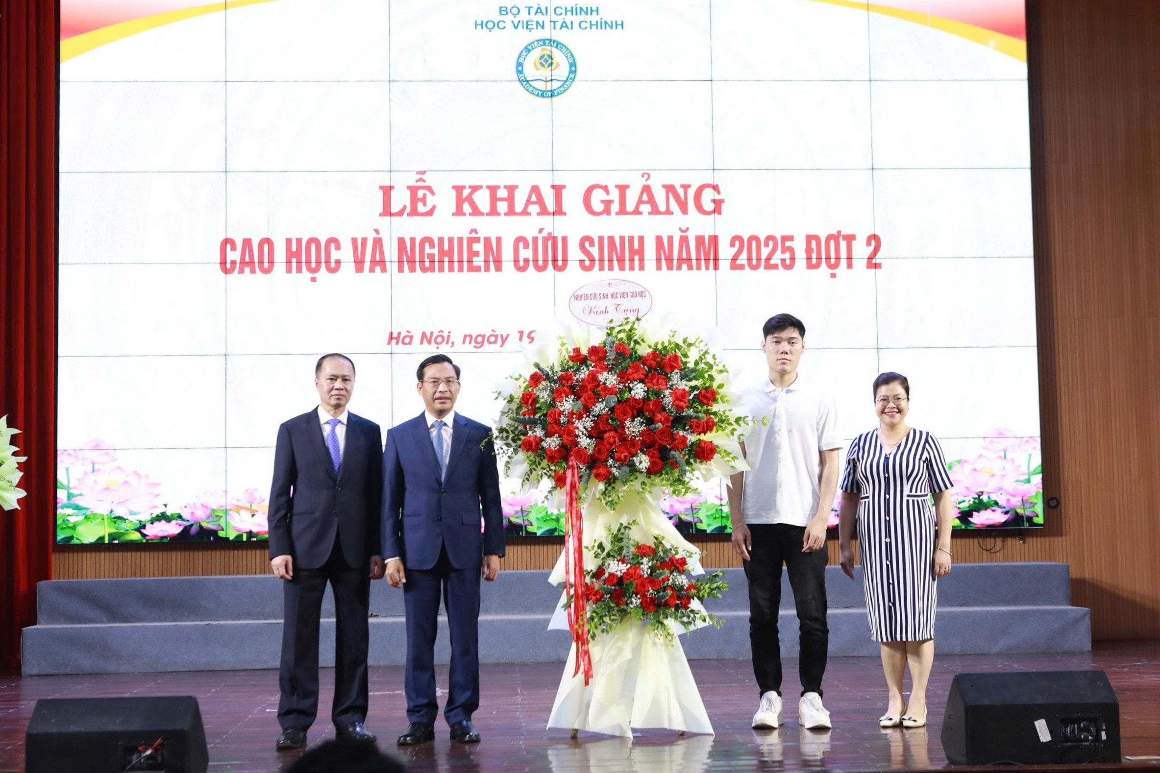 Lãnh đạo Học viện tài chính cùng đại diện các tân học viên, nghiên cứu sinh. Ảnh: Đào Loan