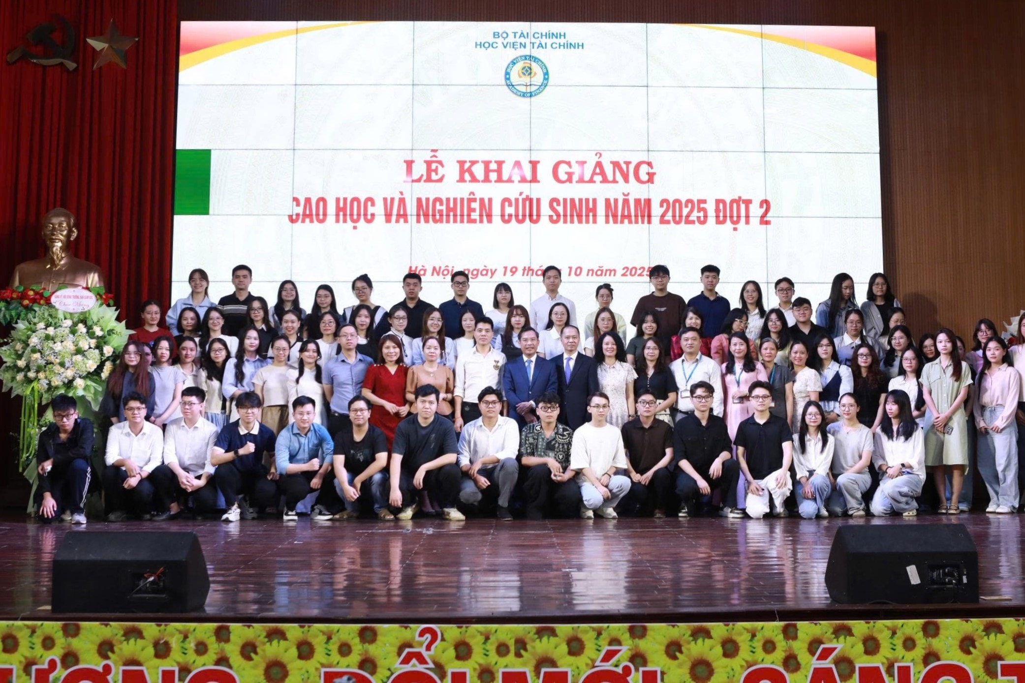 Lãnh đạo Học viện tài chính cùng các tân học viên, nghiên cứu sinh. Ảnh: Đào Loan