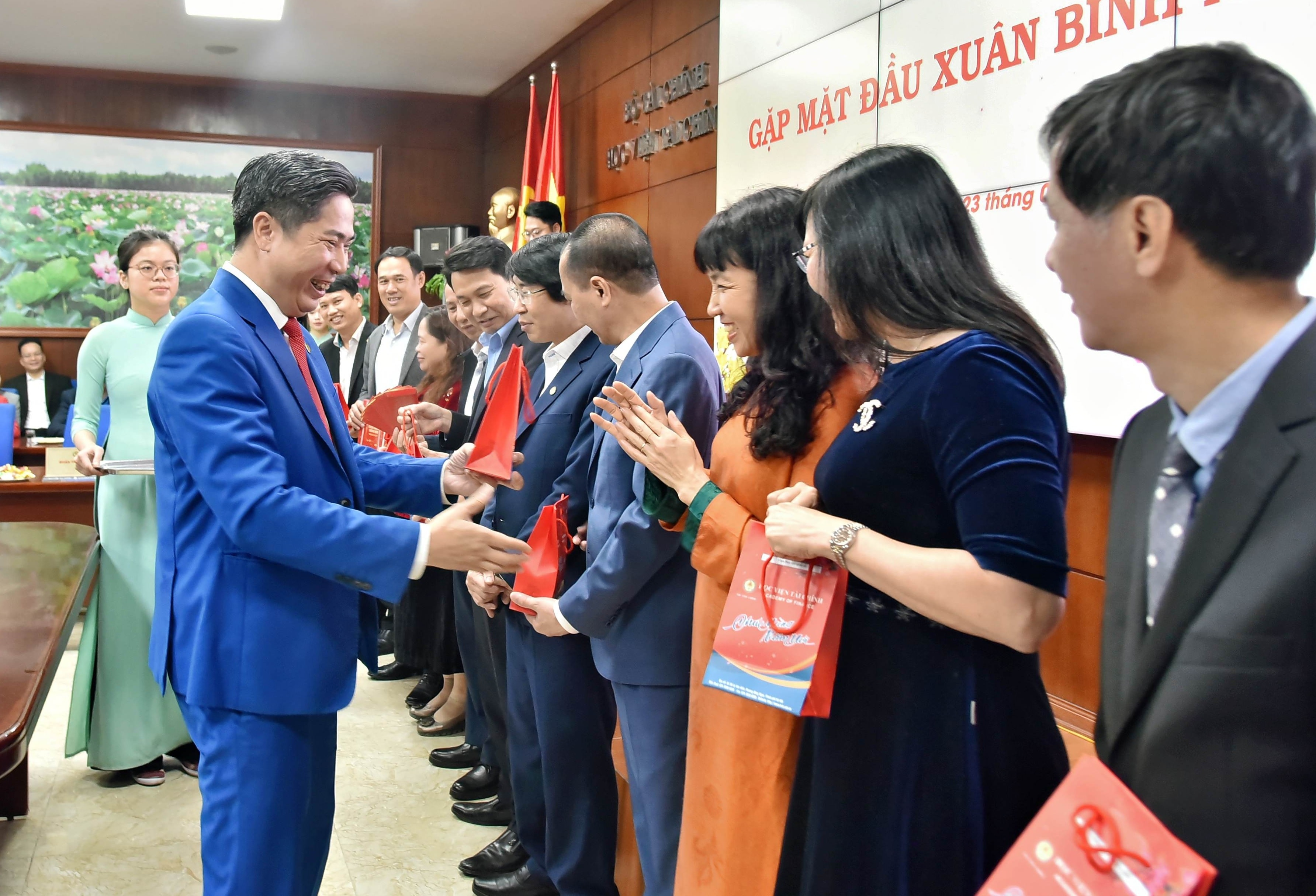 Lãnh đạo Học viện Tài chính trao lì xì cho lãnh đạo các đơn vị trong Học viện. Ảnh: Đào Loan