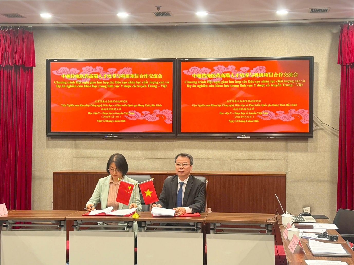 Trong khuôn khổ chuyến công tác, Học viện Y - Dược học cổ truyền Việt Namvà Viện Nghiên cứu Khoa học Công nghệ và Giáo dục Phát triển Quốc gia Hưng Thái (Bắc Kinh, Trung Quốc) đã ký kết Biên bản ghi nhớ hợp tác (MOU). Hai bên đã trao đổi, thảo luận phương án triển khai dự án đào tạo tiến sĩ; trong đó đại diện Đại học Trung Y Dược Bắc Kinh trình bày cụ thể các yêu cầu về năng lực ngoại ngữ, tiêu chuẩn công bố khoa học và các điều kiện đào tạo.