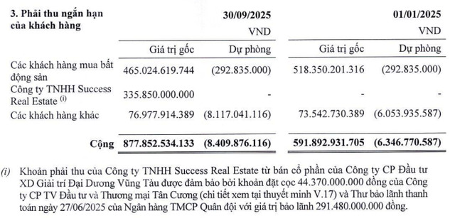Đáng chú ý, Hodeco ghi nhận khoản phải thu ngắn hạn gần 336tỷ đồng từ Công ty TNHH Success Real Estate, phát sinh từ việc bán cổ phần củaCTCP Đầu tư Xây dựng Giải trí Đại Dương Vũng Tàu. Khoản phải thu này được đảm bảobằng tiền đặt cọc hơn 44 tỷ đồng của CTCP Tư vấn Đầu tư và Thương mại TânCương, cùng thư bảo lãnh thanh toán trị giá hơn 291 tỷ đồng do Ngân hàng MBphát hành ngày 27/06/2025.