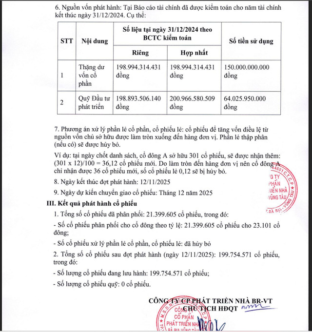 Nguồn vốn phát hành gồm 150 tỷ đồng thặng dư vốn cổ phần và64 tỷ đồng từ quỹ đầu tư phát triển. Tỷ lệ thực hiện quyền là 100:12, tức cổđông sở hữu 100 cổ phiếu sẽ được nhận 12 cổ phiếu mới phát hành. Cổ phiếu khôngbị hạn chế chuyển nhượng.