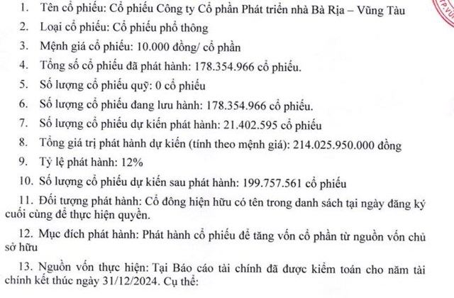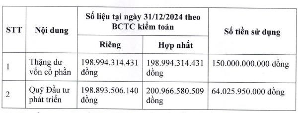 Với mệnh giá cổ phiếu là 10.000 đồng/cổ phiếu, giá trị phát hành theo mệnh giá hơn 214 tỷ đồng. Nguồn vốn dự kiến lấy 150 tỷ đồng từ thặng dư vốn cổ phần và hơn 64 tỷ đồng từ quỹ đầu tư phát triển. Thời gian thực hiện dự kiến là trong quý IV/2025.