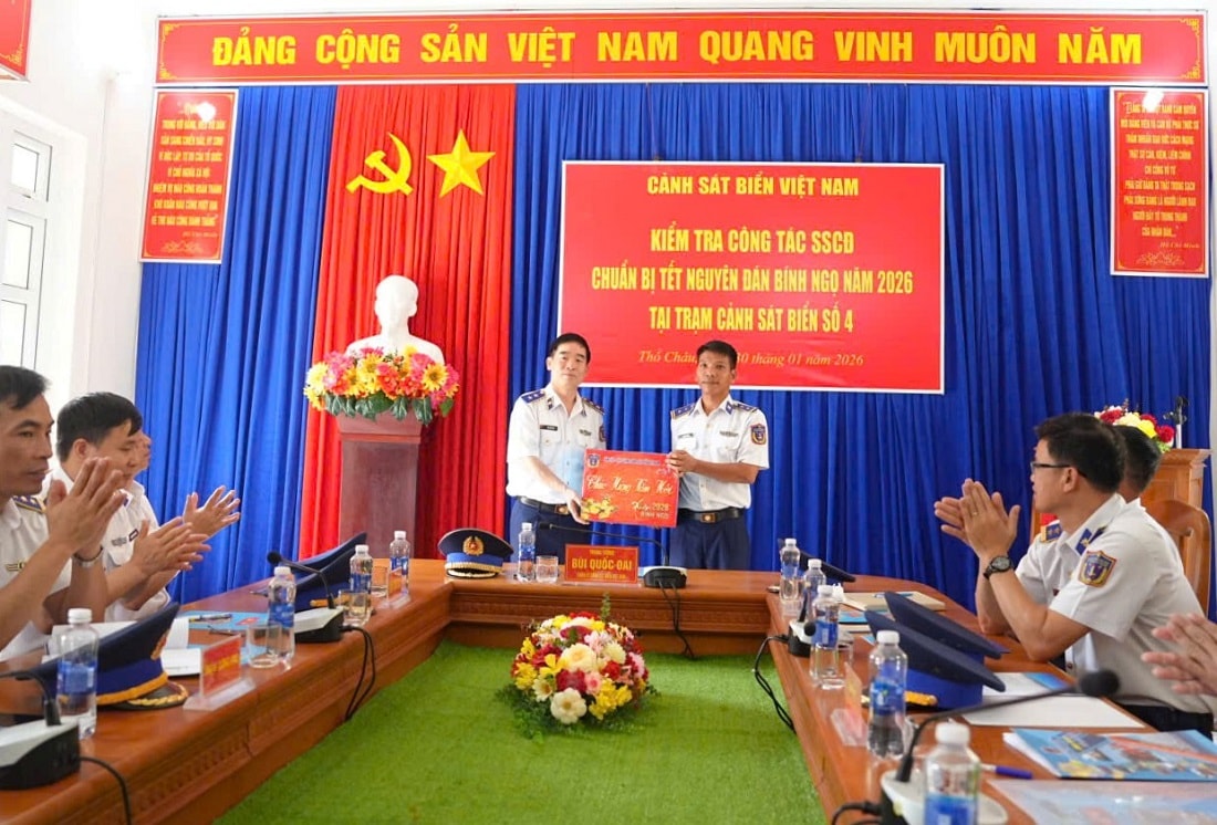 Cùng ngày, Đoàn đã đến kiểm tra công tác SSCĐ và chuẩn bị đón Tết Nguyên đán Bính Ngọ năm 2026 tại Trạm Cảnh sát biển 4/Bộ Tư lệnh Vùng Cảnh sát biển 4; đồng thời thăm hỏi, động viên, chúc Tết cán bộ, chiến sĩ đang thực hiện nhiệm vụ tại đây.
