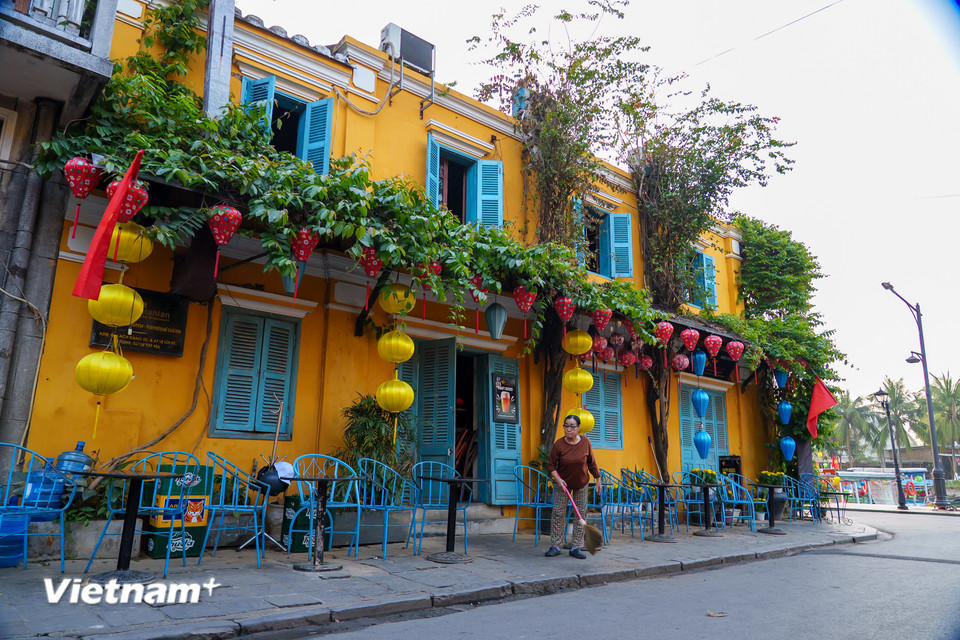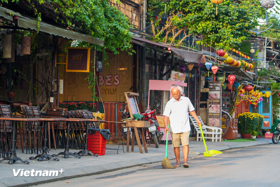 Khi du khách còn say giấc, những người dân phố cổ đã bắt đầu ngày mới với tiếng chổi xao xác, trả lại vẻ tinh tươm cho di sản. (Ảnh: Thanh Phong/Vietnam+)