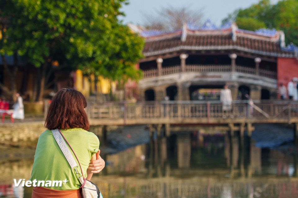 Một góc nhìn khác về Chùa Cầu từ bờ sông đối diện, nơi chỉ có sự bình yên hiện hữu. (Ảnh: Thanh Phong/Vietnam+)