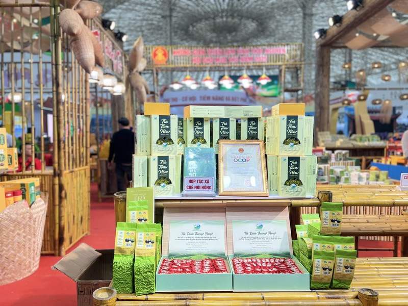 Các sản phẩm của Hợp tác xã chè Núi Hồng được giới thiệu tại hội chợ.
