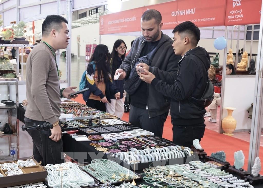 Khách quốc tế tham quan các gian hàng tại Hội chợ Mùa Xuân 2026. Ảnh: Minh Quyết - TTXVN