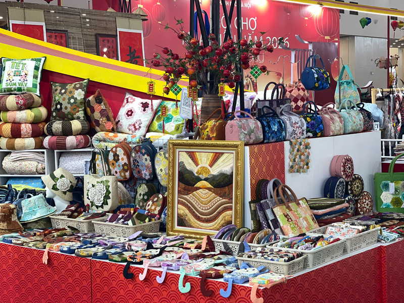 Tham gia Hội chợ Mùa Xuân 2026, nhiều hộ kinh doanh ở các địa phương tiếp tục giới thiệu tới người tiêu dùng các sản phẩm đặc trưng. Gắn với thế mạnh truyền thống, sản phẩm ghép từng mảnh vải nhỏ thủ công để tạo thành các bức tranh, túi, chăn gối mang tính độc đáo mới thu hút nhiều đối tượng khách hàng mua sắm.