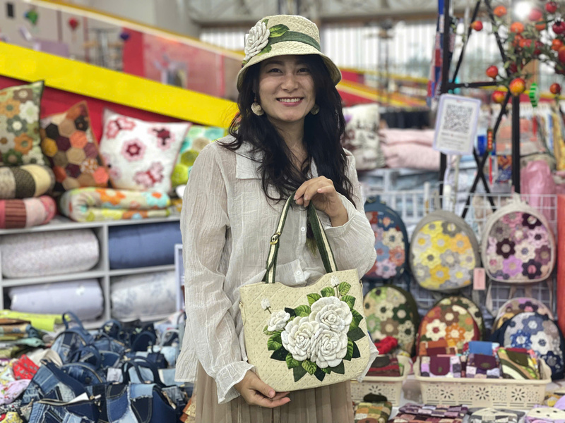 Chị Dương Thị Thùy Linh, người sáng lập sản phẩm thủ công từ vải - Rosequilt cho biết, là đơn vị đã tham gia chương trình xúc tiến thương mại như Hội chợ Mùa Thu 2025 và nay là Hội chợ Mùa Xuân 2026, ngoài các sản phẩm tiểu biểu như túi đựng lì xì, ví nhỏ, gối tựa lưng,… thì gian hàng mang đến bộ túi Lặng lẽ Hải Đường, đây là bộ tú đạt giải nhất cuộc thi thi thiết kế thủ công mỹ nghệ của Thành phố Hà Nội năm 2025, hay bức tranh nắng chiều Tây Bắc; bộ túi hơi thở Đông Sơn đồng giải khuyến khích cuộc thi thiết kế của Sở Nông nghiệp và Môi trường địa phương.