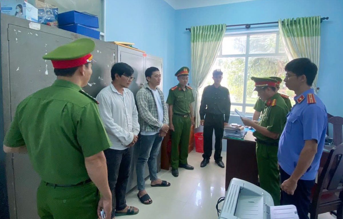 Công an đọc lệnh bắt tạm giam 2 nhân viên bán hàng có hành vi tham ô với sự tham gia kiểm sát của Viện Kiểm sát nhân dân cùng cấp. Ảnh: VKS