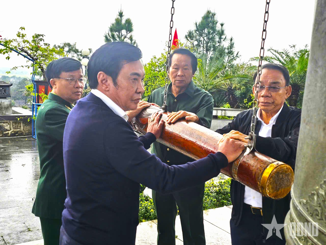 Anh hùng Lao động Thân Đức Nam và các đại biểu thỉnh chuông tại Nghĩa trang Liệt sĩ Quốc gia Đường 9.