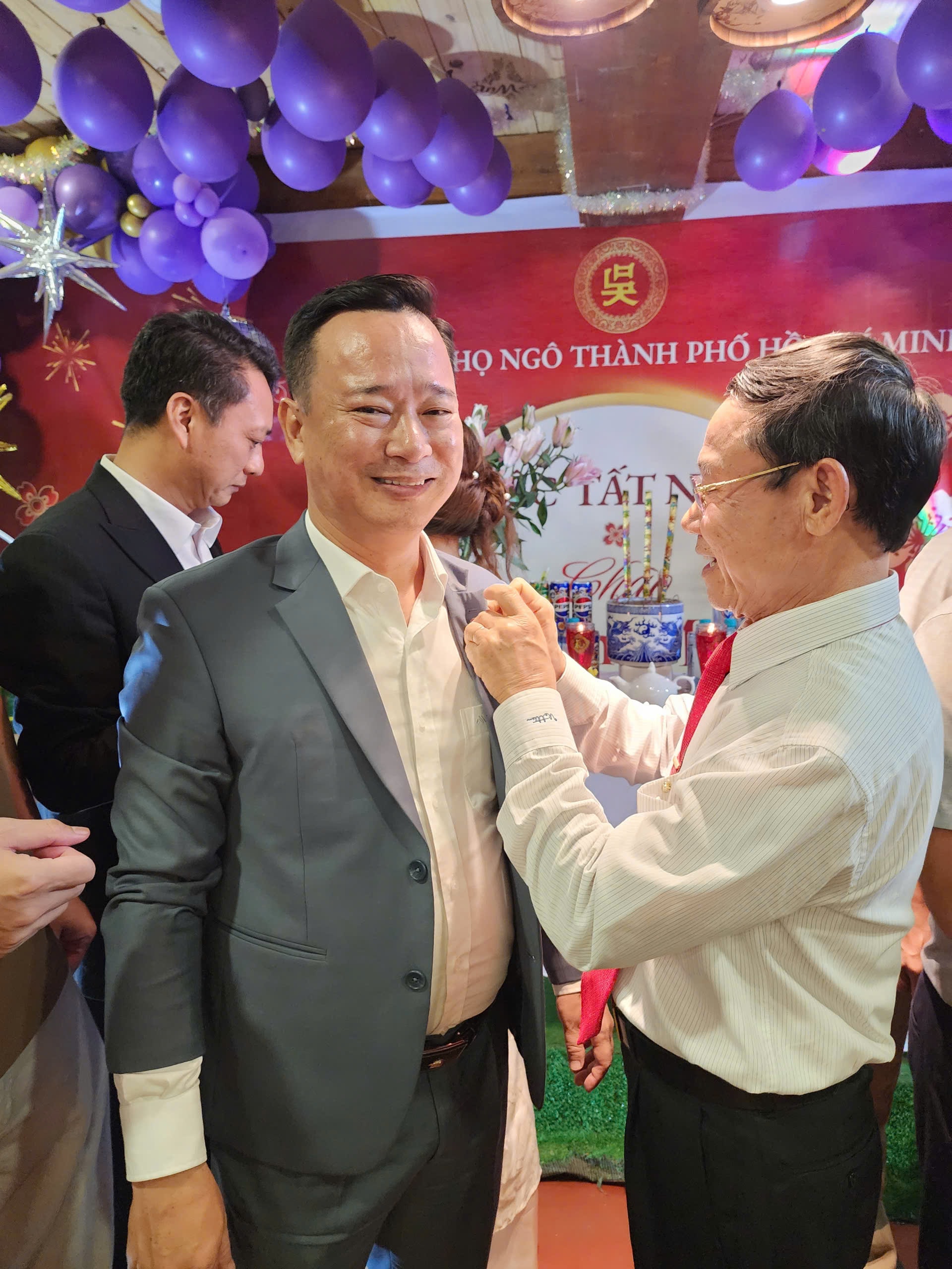 Ông Ngô Văn Phát - Chủ tịch Hội đồng họ Ngô TP.HCM gắn huy hiệu họ Ngô cho các thành viên trong Ngô tộc