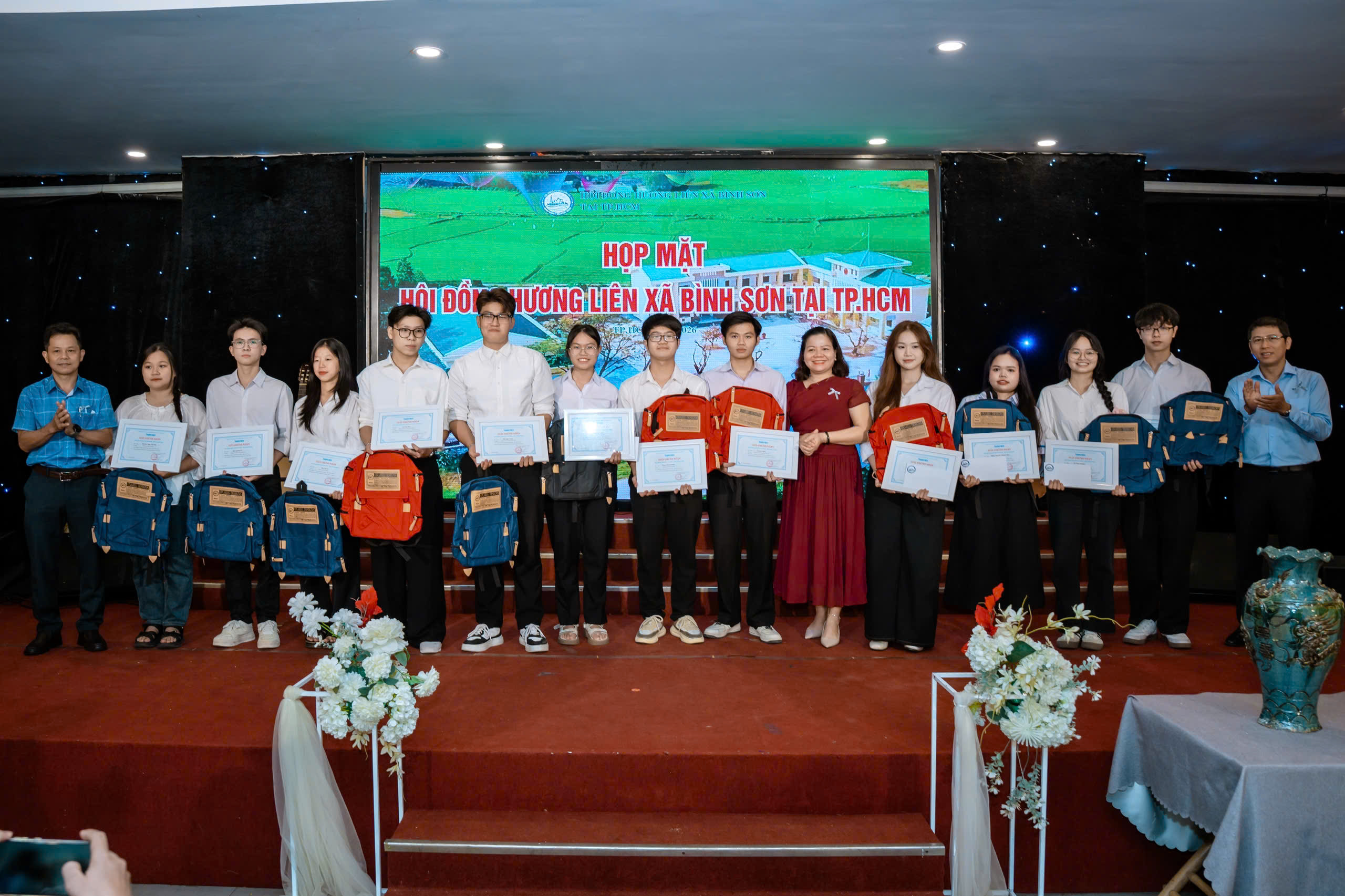 Ngày 26-4, đại diện Hội đồng hương liên xã Bình Sơn (Quảng Ngãi), cho biết tại buổi họp mặt Hội đồng hương liên xã Bình Sơn tại TP.HCM vào tối 25-4, hội phối hợp với Đảng ủy, HĐND, UBND, Ủy ban MTTQ Việt Nam xã Bình Sơn, xã Đông Sơn và xã Vạn Tường trao tặng 24 suất học bổng cho sinh viên có hoàn cảnh khó khăn quê Quảng Ngãi đang học tại TP.HCM.
