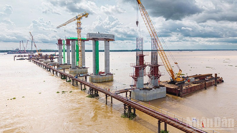 Tập đoàn Định An đã huy động đến công trường các phương tiện, thiết bị thi công gồm cần cẩu, máy đào, sà-lan, xe trộn và bố trí gần 100 công nhân tổ chức thi công 3 ca liên tục suốt ngày, đêm. Đến nay, đơn vị cơ bản hoàn thành 90/90 cọc khoan nhồi, các trụ giữa sông và bệ trụ cũng được thi công đồng loạt, sản lượng thi công ước đạt 70% giá trị hợp đồng.