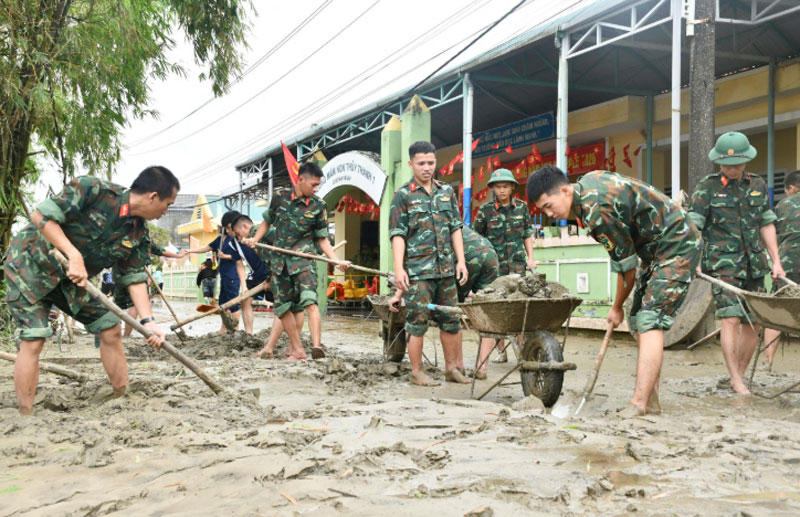 Sáng 31-10, hơn 500 cán bộ, chiến sĩ của Sư đoàn 968, Quân khu 4 được lệnh cơ động vào TP Huế, mang theo phương tiện, dụng cụ và vật chất hậu cần. Từng đoàn xe nối nhau tiến vào các khu dân cư, trường học, chợ và những khu vực công cộng bị ảnh hưởng nặng.