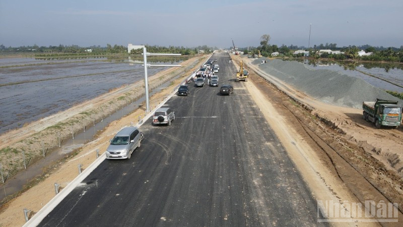 Dọc một số nơi trên tuyến cao tốc đi qua tỉnh An Giang, các nhà thầu đang tăng tốc thi công lắp đặt cống, hố ga, thi công đào khuôn đường và lu lèn mặt đường... Theo Ban quản lý dự án tỉnh An Giang, toàn tuyến xây dựng 5 nút giao, với 33 cầu; có hệ thống giao thông thông minh (ITS) và hệ thống thu phí không dừng và Trạm dừng nghỉ tại Km22 +300...