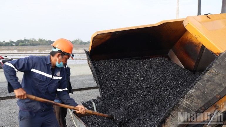 Có mặt ở ấp Vĩnh Hòa 1, xã Vĩnh Hanh chúng tôi thấy các công nhân tất bật di chuyển trên công trường. Người xúc đá nhựa, người rải đá nhựa trên tuyến đường, người cào đá, người điều khiển xe lu chạy qua các đoạn đường vừa rải đá nhựa...