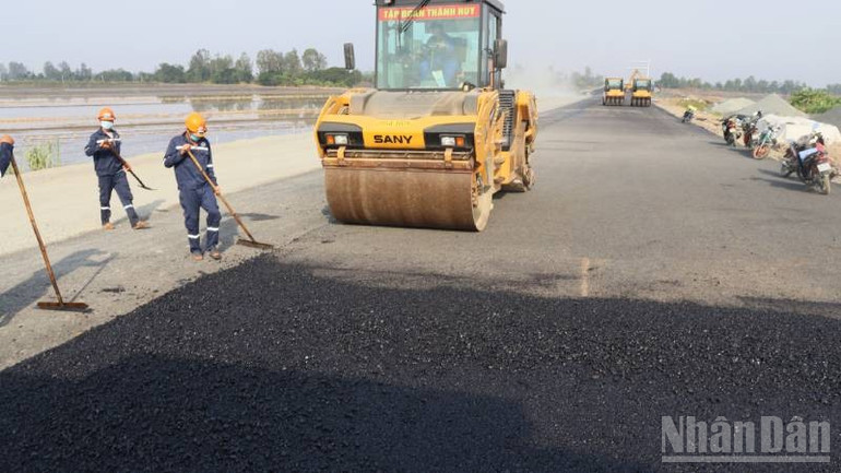 Đoàn công tác đến kiểm tra thực tế tình hình thi công, trải thảm nhựa tại nút giao đường tỉnh 941, cầu đường tuyến giao. Tại đây, đồng chí và đoàn công tác đã nghe các nhà thầu báo cáo tiến độ thi công các gói thầu số 42, 43, 44 và 45.