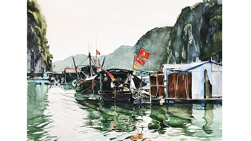Chợ cá trên vịnh Cát Bà, mầu nước, 56x76cm 2025.