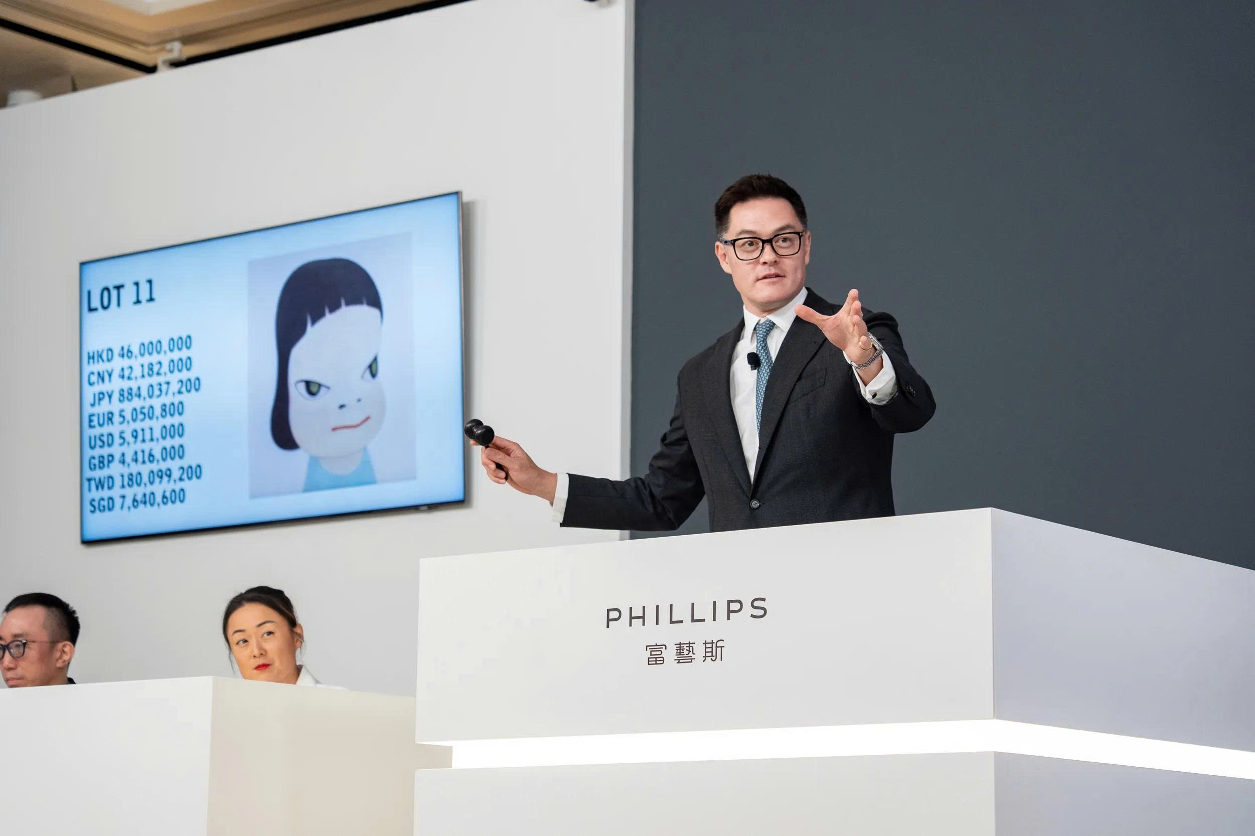 Trong phiên Modern & Contemporary Evening Sale, Jonathan Crockett, Chủ tịch Phillips châu Á kiêm người điều hành đấu giá, đã trực tiếp gõ búa cho lot 11, tác phẩm Pinky (2000) của Yoshitomo Nara. Ảnh: Courtesy Phillips.