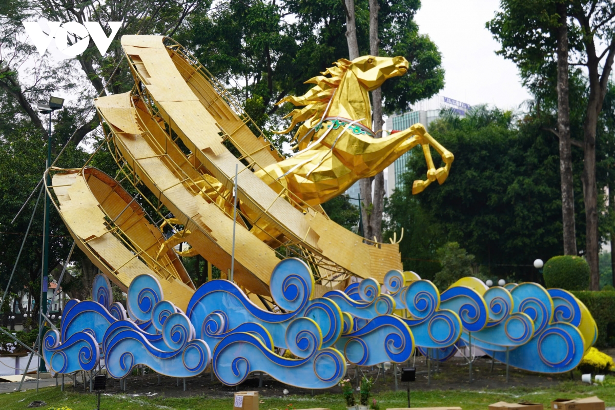 Các không gian hoa, cây kiểng đang tất bật được bố trí về cơ bản dần hoàn tất. Các công nhân vẫn đang thi công hoàn thiện một số tiểu cảnh như mái che hay linh vật ngựa.