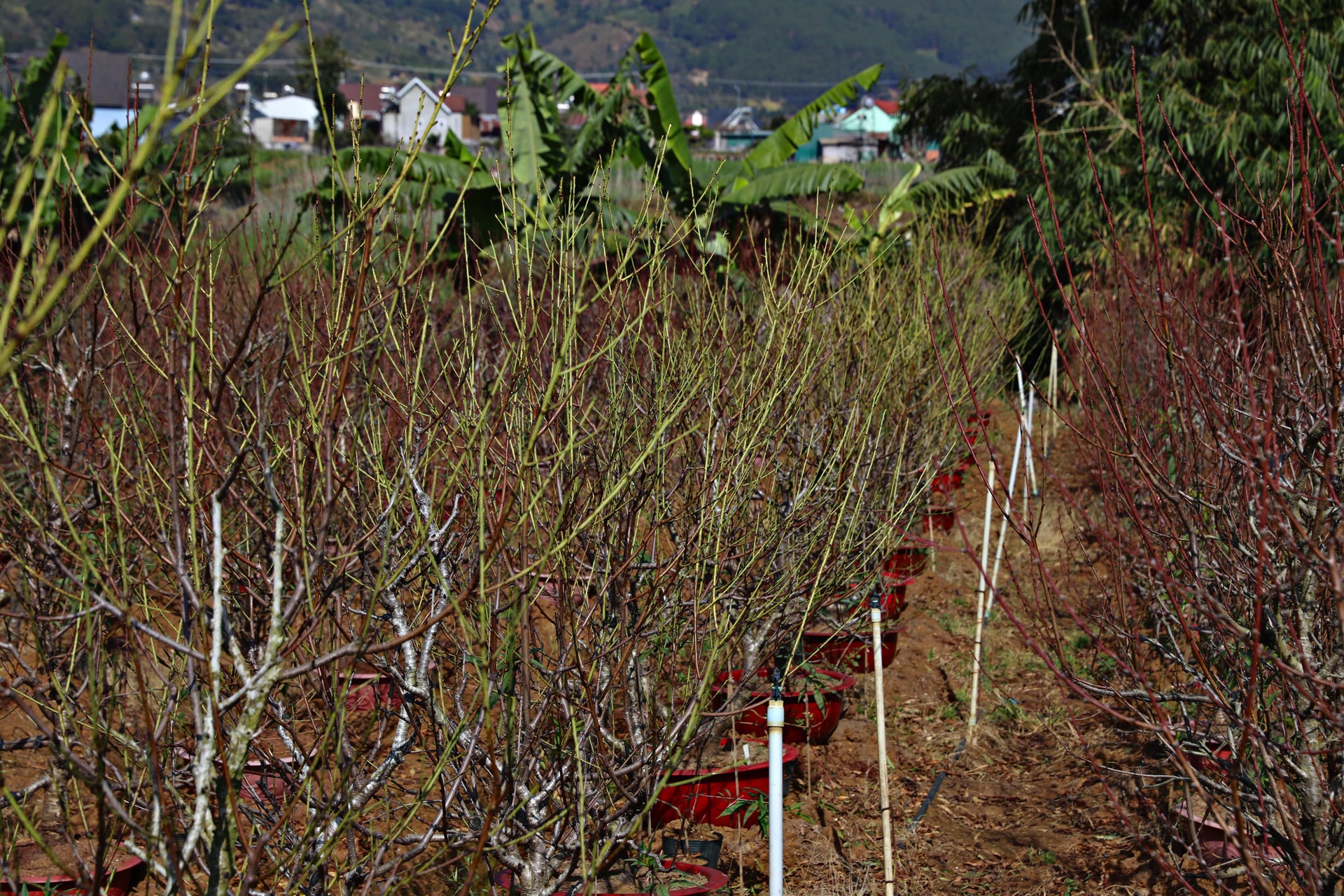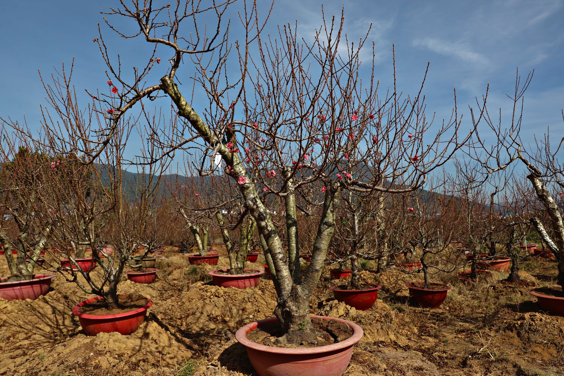 Những gốc đào đã được tuốt lá, cắt tỉa gọn gàng sẵn sàng bung nở đón Tết