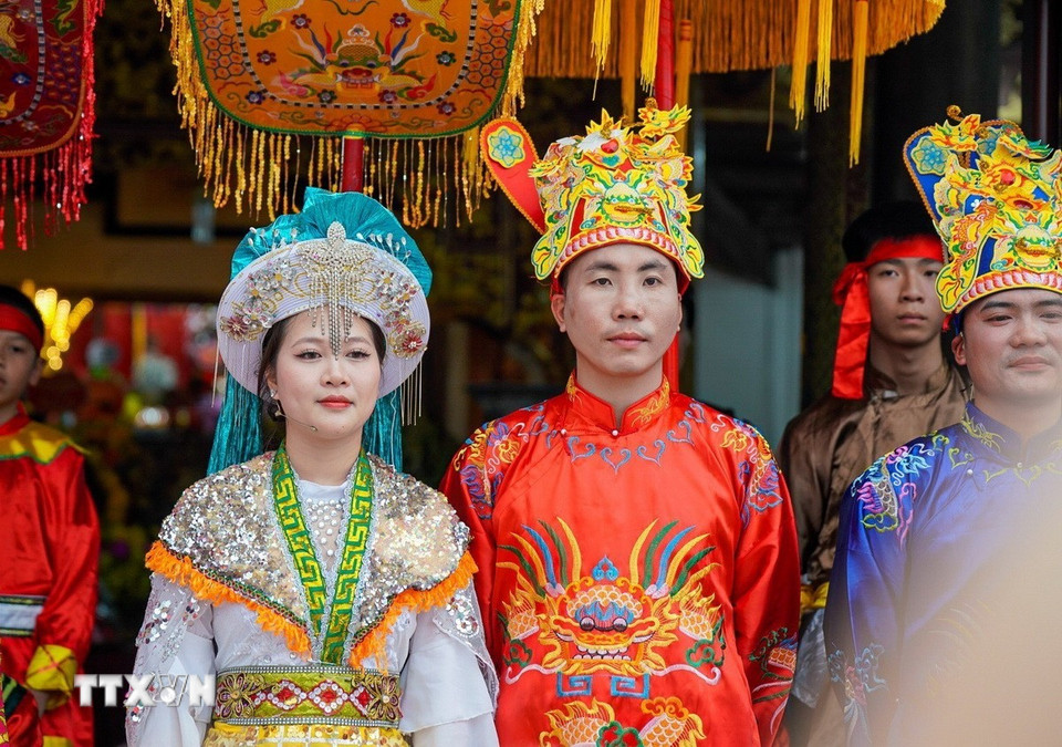 Những bộ trang phục đặc sắc cũng được trình diễn trong tiết mục, góp phần tái hiện sinh động nghi lễ kén rể truyền thống. (Ảnh: Hà Anh/TTXVN)