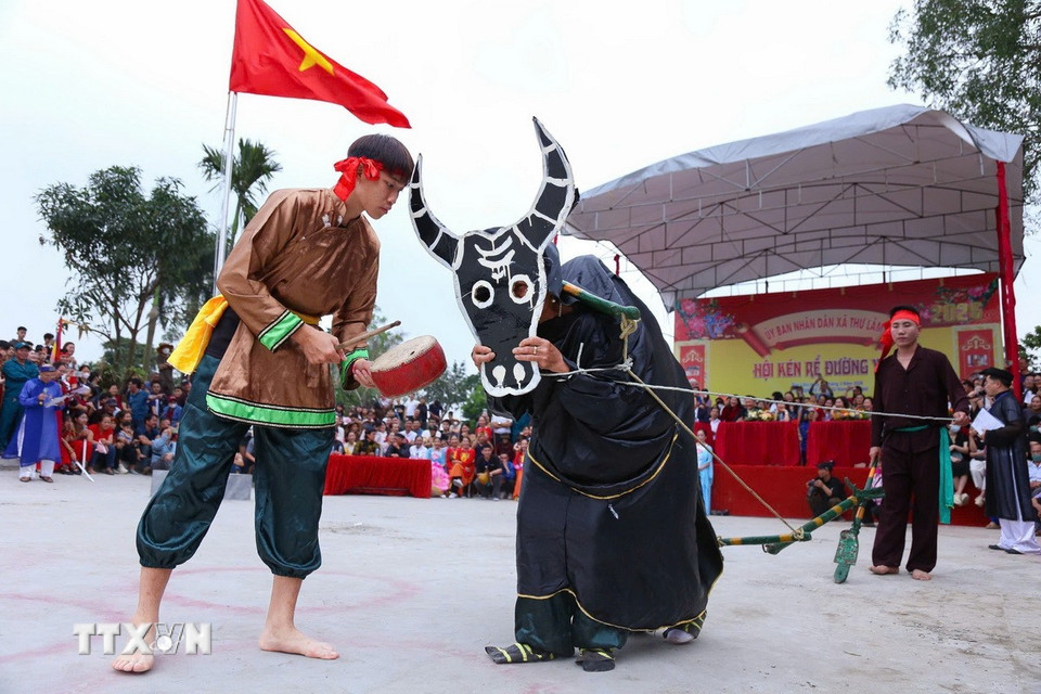 Mở đầu phần hội là thi canh nông. Trên sân đình, hai chàng trai tham gia tranh tài trong vai người nông dân cày ruộng, cùng với hai người khác hóa thân thành trâu, đeo mặt nạ để tái hiện khung cảnh lao động. (Ảnh: Hà Anh/TTXVN)