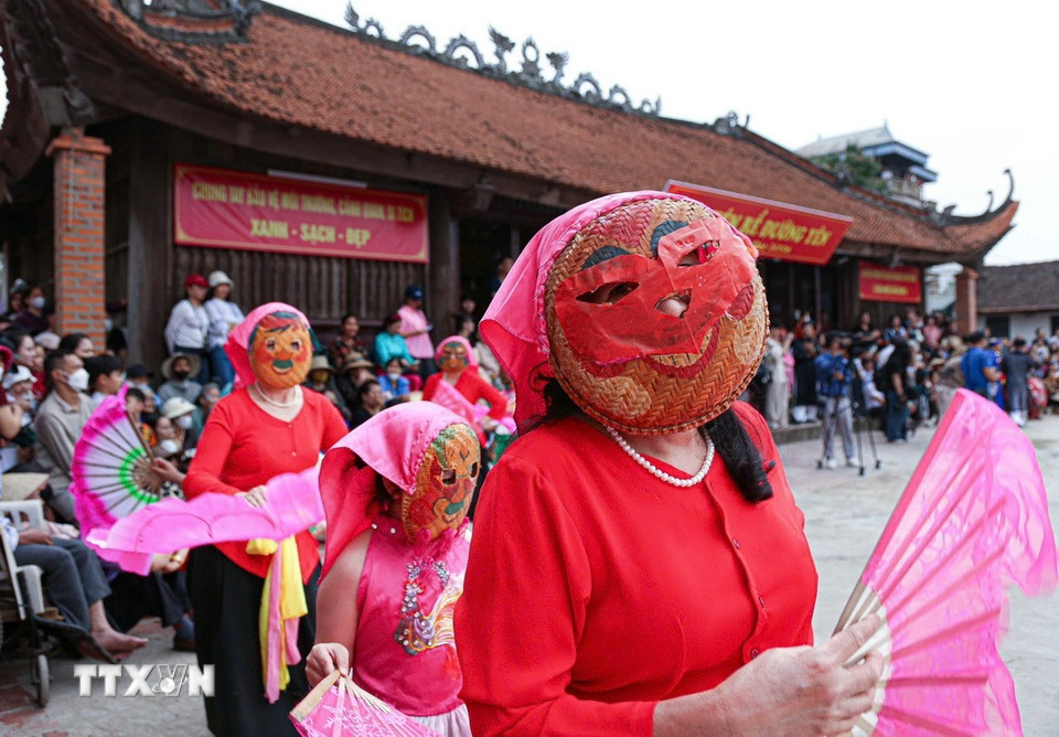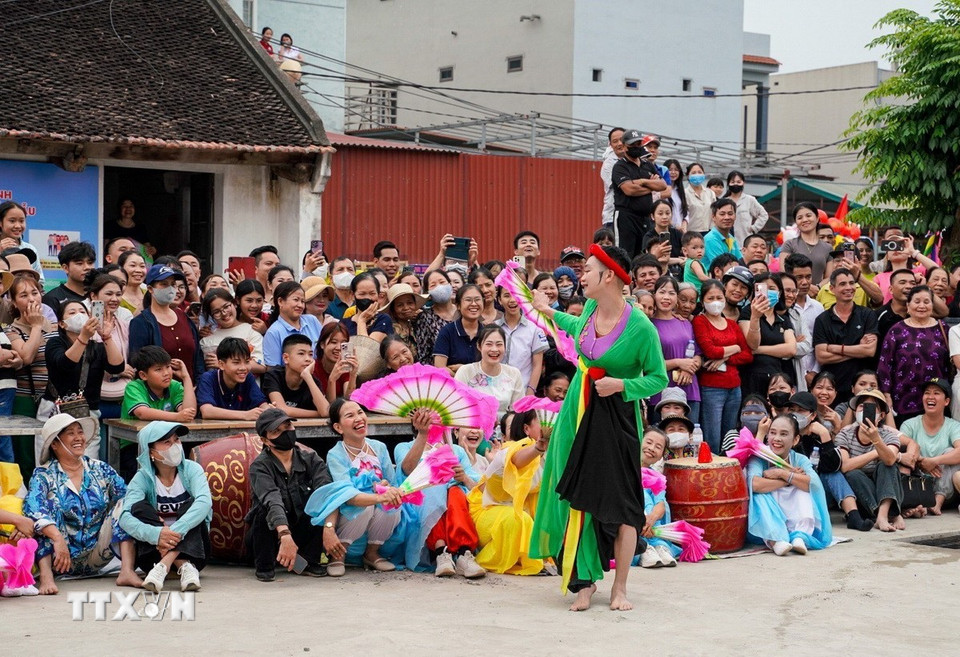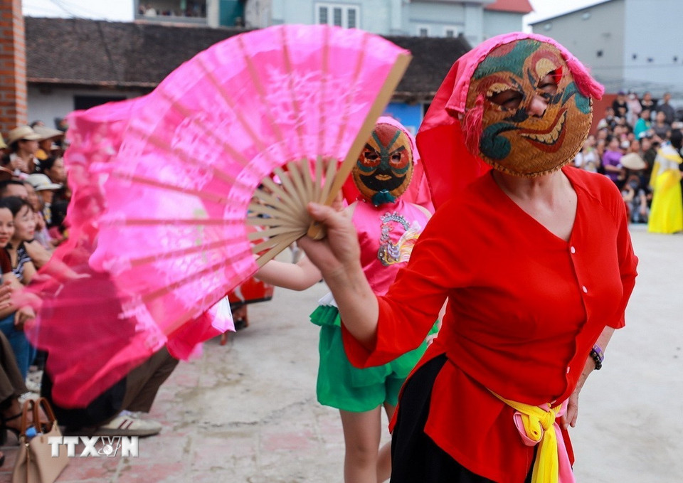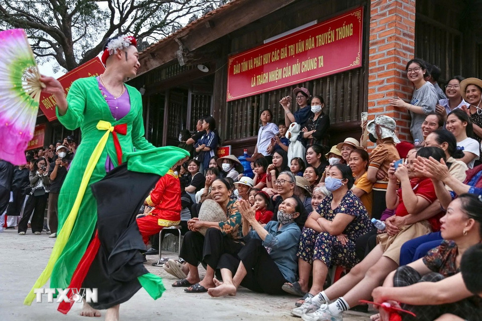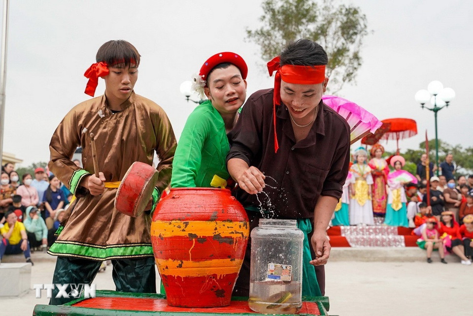 Các tích trò đều dựa trên thực tế sản xuất nông nghiệp, thể hiện ước vọng của người dân về cuộc sống ấm no, hạnh phúc, mưa thuận gió hòa. (Ảnh: Khánh Hòa/TTXVN)