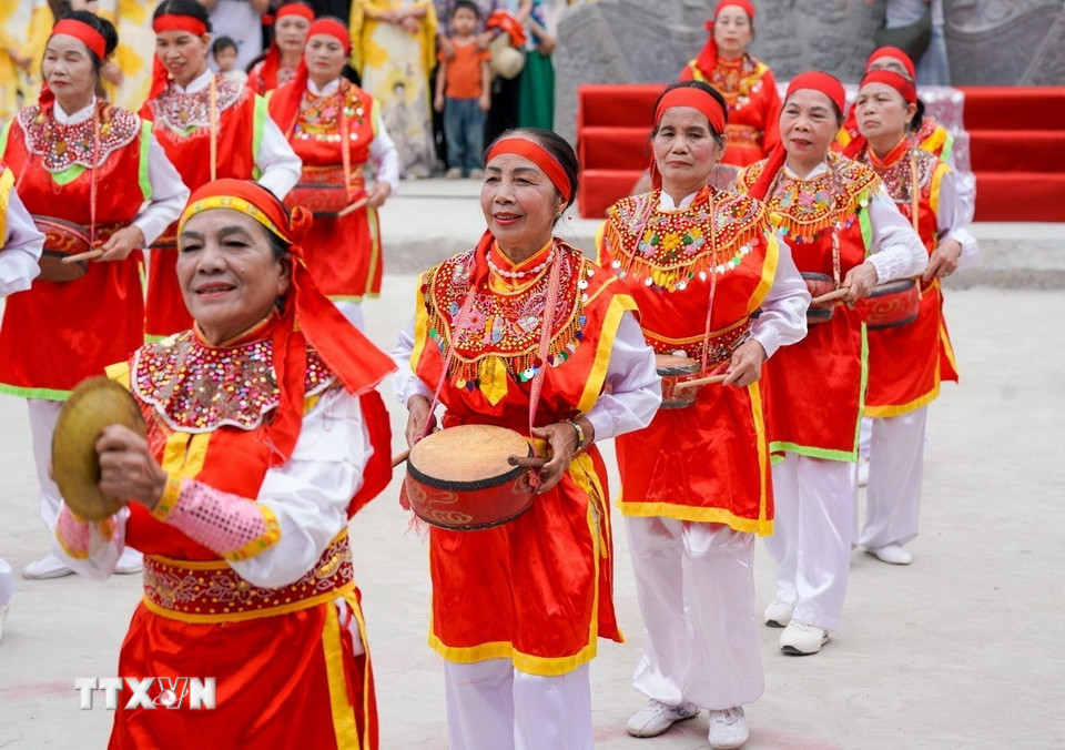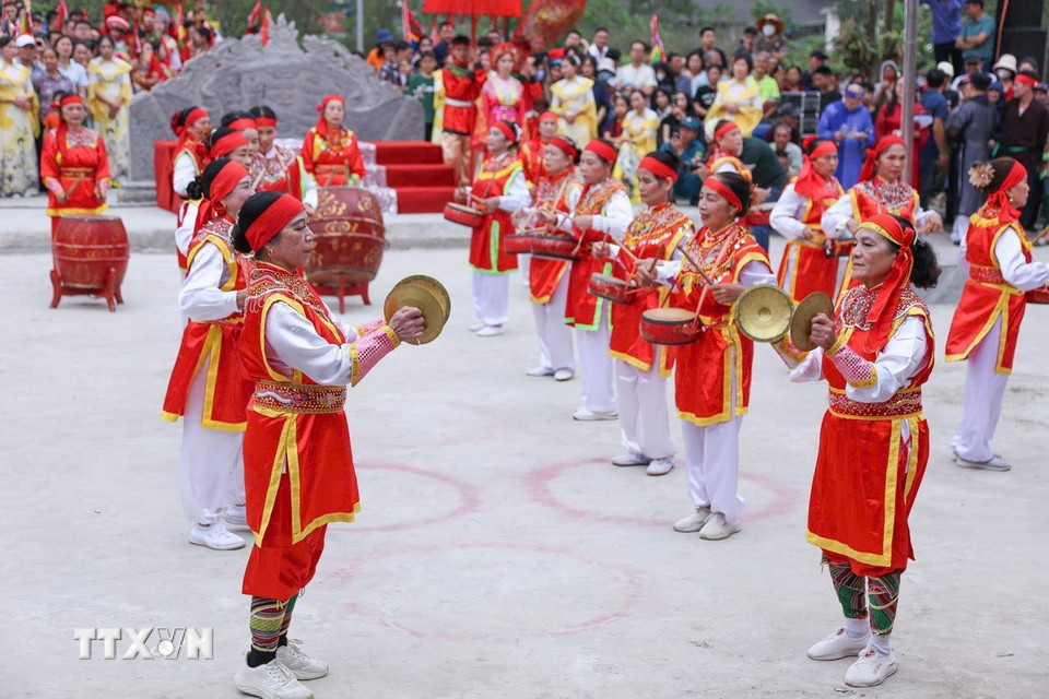 Lễ hội được diễn ra với mở màn là màn biểu diễn trống hội trong sự náo nhiệt và hào hứng của người dân thôn Đường Yên. (Ảnh: Hà Anh/TTXVN)