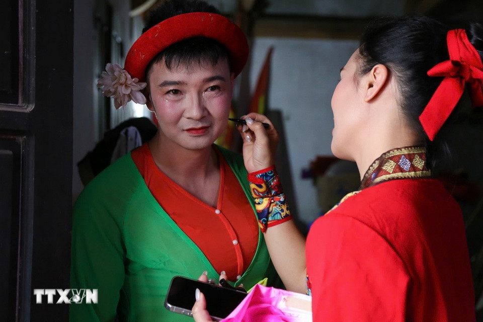 Những người trong đoàn biểu diễn Lễ hội kén rể có mặt để chuẩn bị những bước cuối cùng. (Ảnh: Hà Anh/TTXVN)