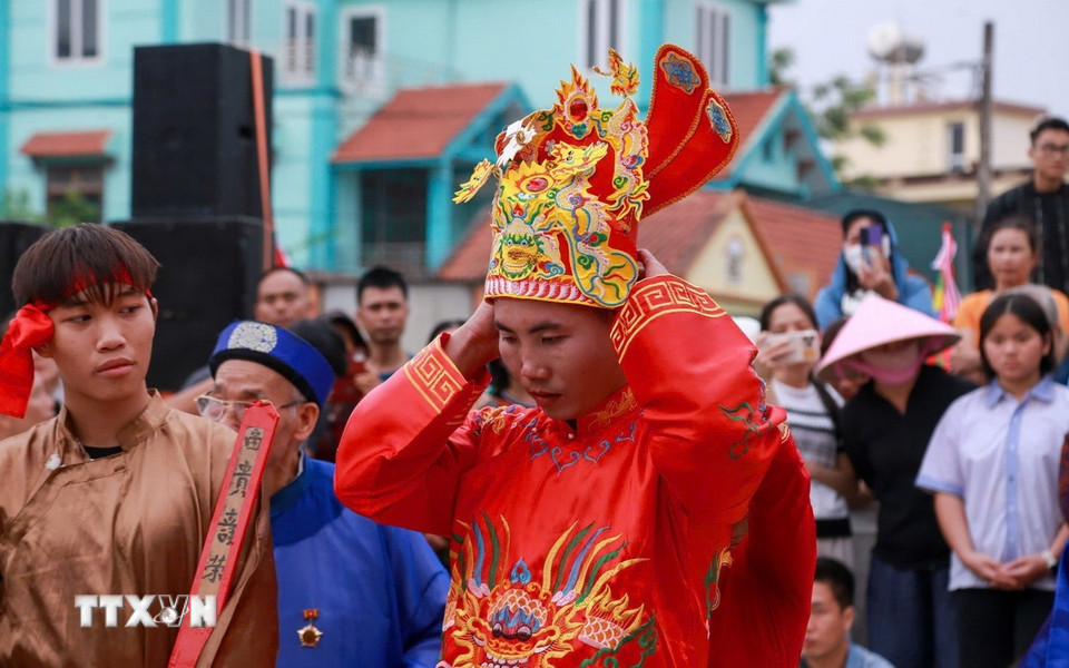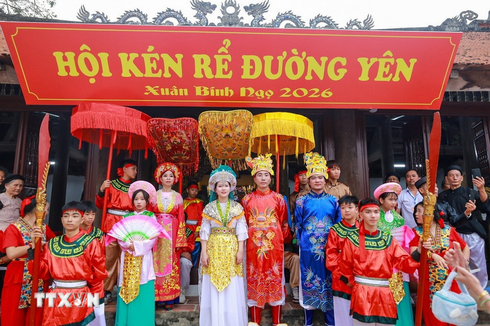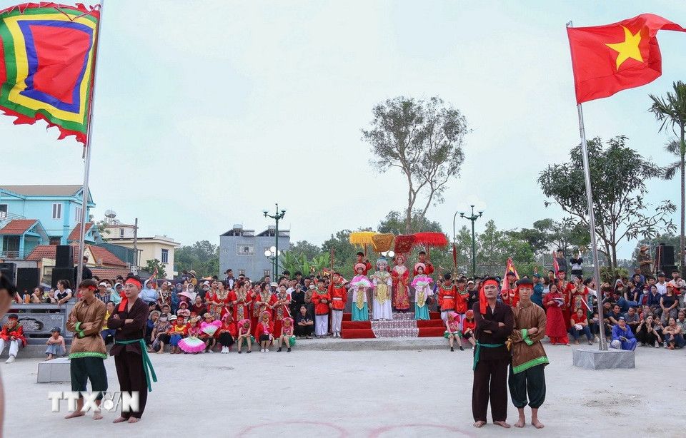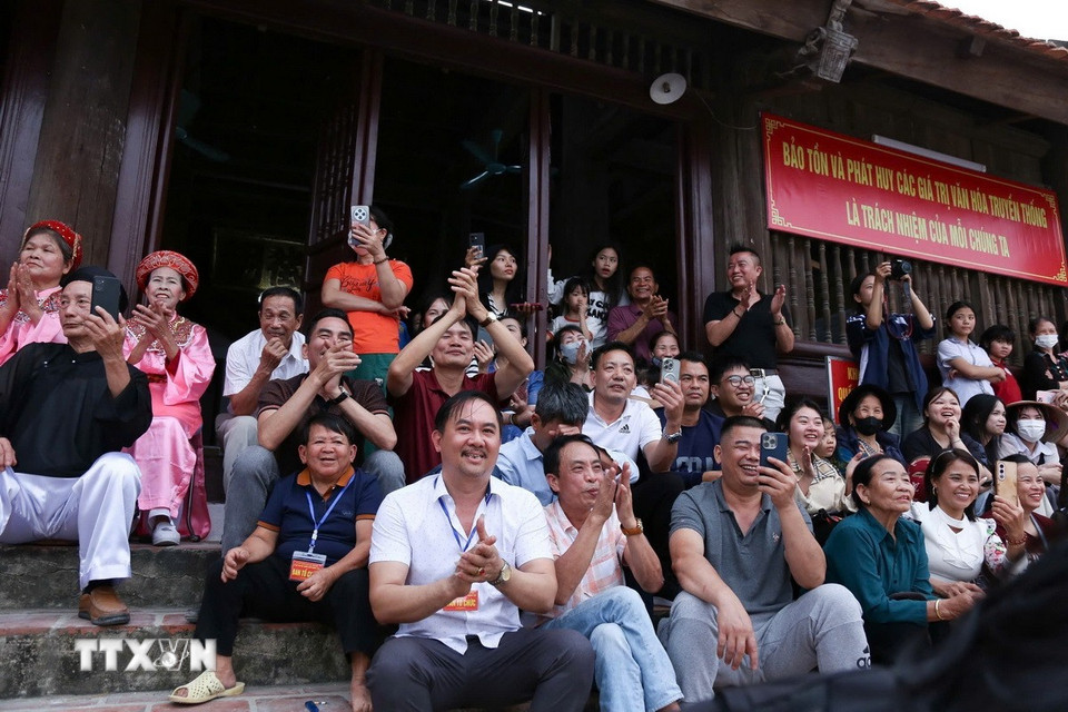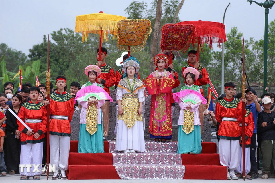 Lễ công bố Quyết định ghi danh Lễ hội truyền thống Hội Kén rể Đường Yên vào Danh mục di sản văn hóa phi vật thể quốc gia. (Ảnh: Khánh Hòa/TTXVN)