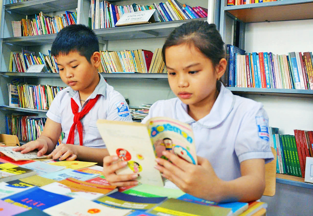 Các em thiếu nhi đọc sách tại thư viện thôn Phú Mẫn, xã Yên Phong. Ảnh: Xuân Me.